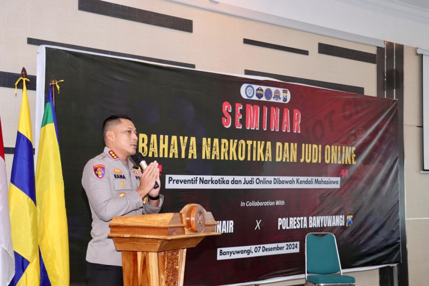 BANYUWANGI (AktualLine.com)–Kapolresta Banyuwangi Kombes Pol  Rama Samtama Putra yang didampingi Kasat Resnarkoba Kompol M. Khoirul   menghadiri seminar tentang bahaya narkotika dan judi online yang diselenggarakan di Kampus Universitas Airlangga Banyuwangi, Sabtu,(7/12/2024).