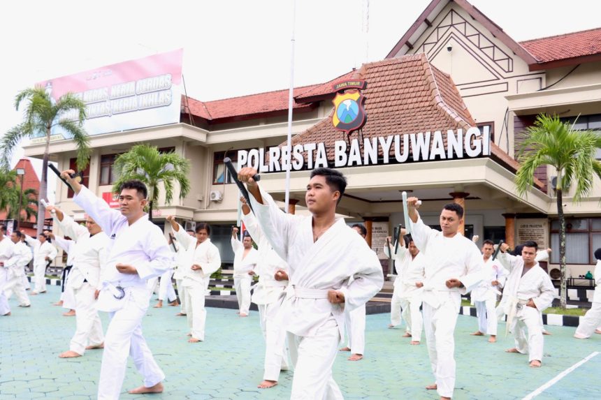 BANYUWANGI (AktualLine.com)–Guna meningkatkan kemampuan anggota dalam kemampuan fisik, Polresta Banyuwangi melaksanakan latihan bela diri.