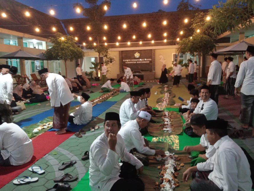 Kebersamaan semakin terasa saat ratusan ASN berkumpul untuk berbuka puasa dengan cara yang penuh makna dan filosofi. Mereka duduk melingkar di atas daun pisang, menikmati hidangan sederhana namun sarat arti, seperti terong bakar dan ikan asin. Makanan ini bukan hanya sebagai santapan, tetapi juga simbol persaudaraan dan nilai-nilai kesederhanaan yang diwariskan dari tradisi pesantren.