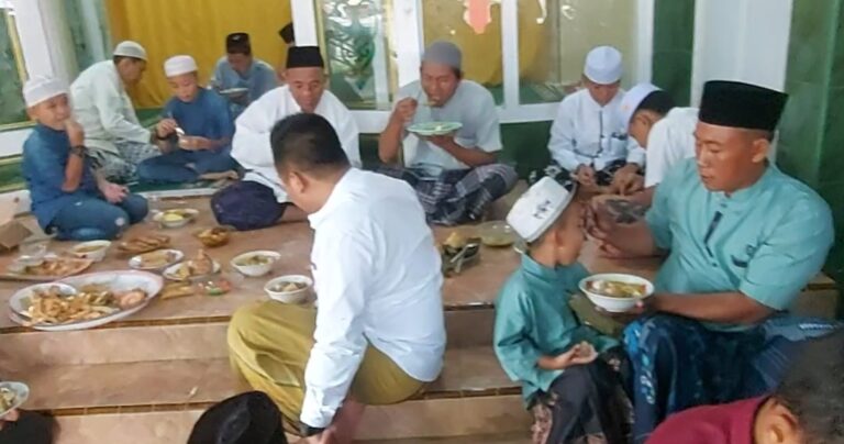 Setelah doa bersama, warga duduk melingkar menikmati hidangan yang telah disusun rapi di teras mushola. Berbagai menu khas tersaji, mulai dari nasi atau lontong dengan kare ayam hingga lauk pauk lainnya. Tak sedikit pula yang membawa buah-buahan sebagai pelengkap.