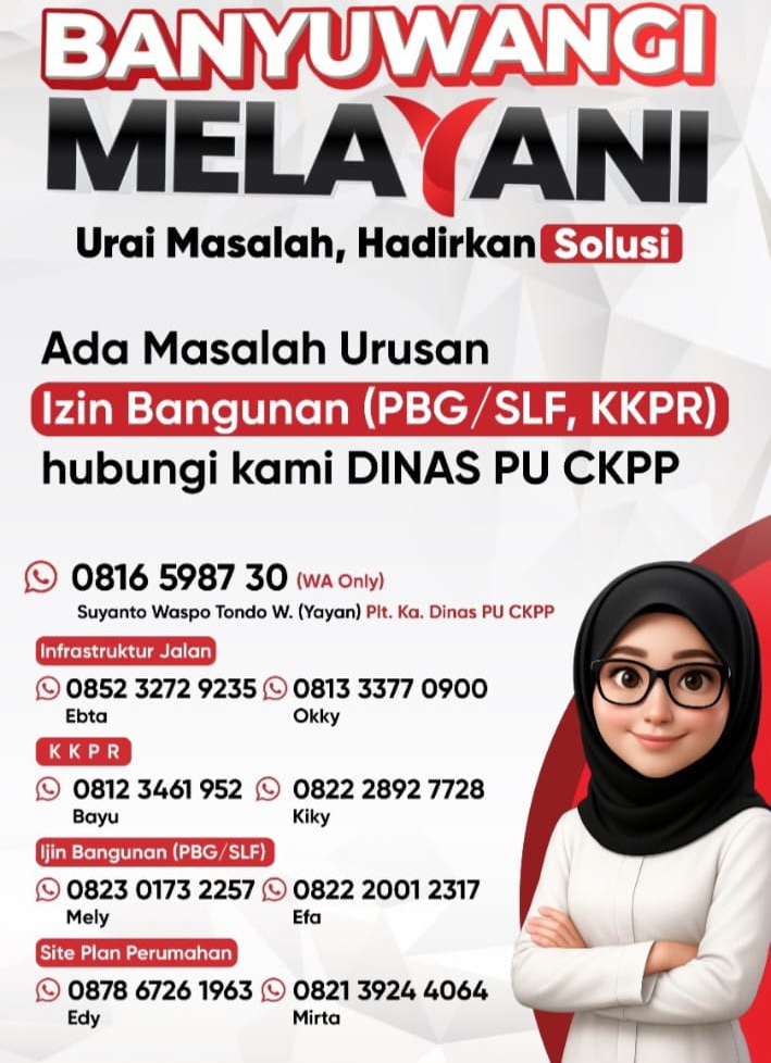 Pelaksana Tugas (Plt.) Kepala Dinas DPU CKPP Banyuwangi, DR. Suyanto Waspo Tondo Wicaksono, M.Si., atau yang akrab disapa Yayan, menegaskan pentingnya kemudahan dalam pengurusan layanan seperti Persetujuan Bangunan Gedung (PBG), Sertifikat Laik Fungsi (SLF), Kesesuaian Kegiatan Pemanfaatan Ruang (KKPR), hingga berbagai urusan infrastruktur lainnya.