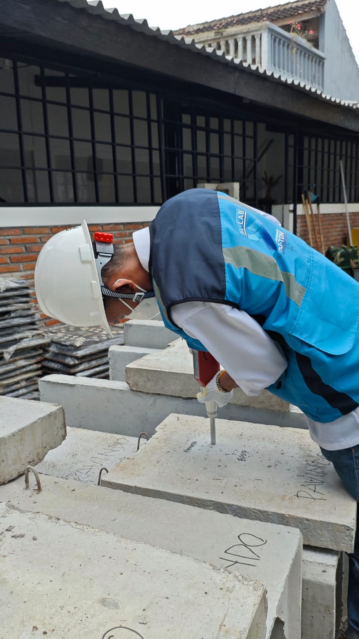 Tim teknis dari Jabatan Fungsional Pembina Jasa Konstruksi turun langsung dalam proses pengujian. Dengan alat khusus, tekanan dipantulkan ke permukaan beton untuk mendapatkan nilai kekuatan tekan secara cepat dan akurat.