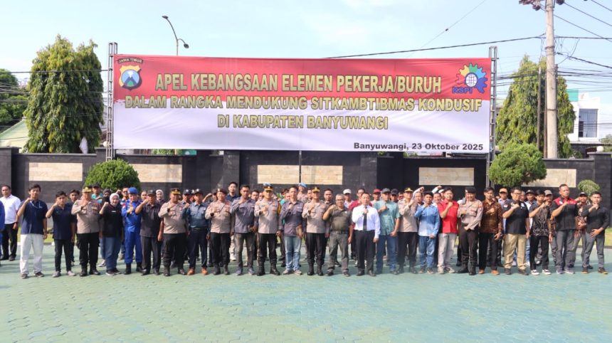 BANYUWANGI (AktualLine.com)–Ratusan anggota serikat pekerja dan buruh se-Kabupaten Banyuwangi memadati halaman Mapolresta Banyuwangi pada Kamis (23/10/2025) pagi. Mereka hadir dalam Apel Kebangsaan sebagai wujud dukungan terhadap Polri dalam menjaga keamanan dan ketertiban masyarakat (Sitkamtibmas) di wilayah Banyuwangi.