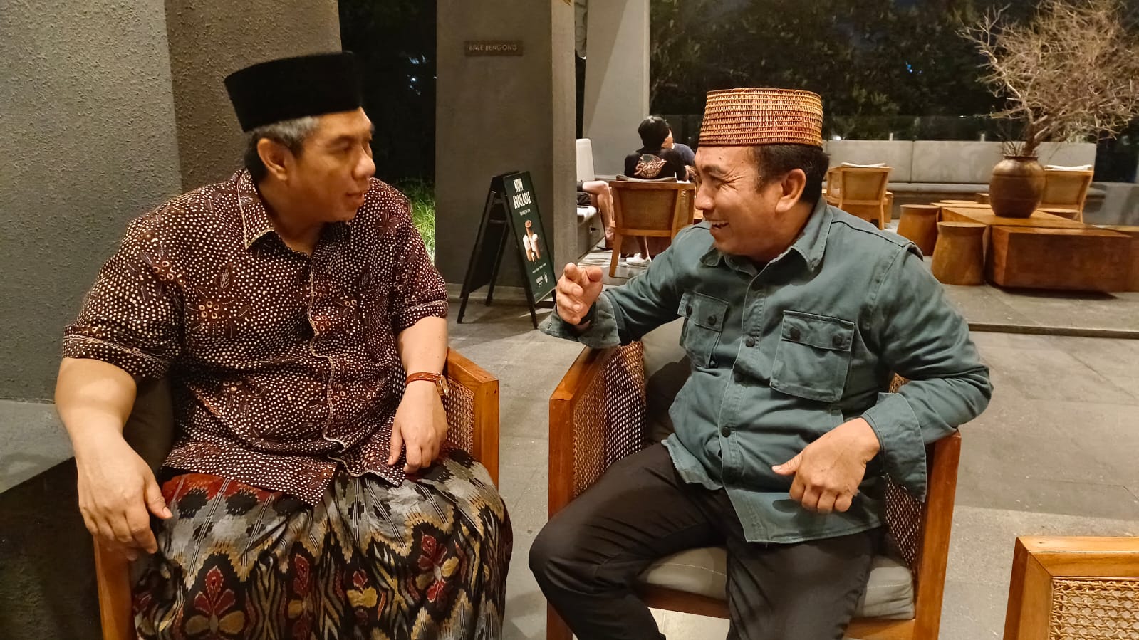 Moh. Karyono (kanan) berbincang dengan Pj Ketua Umum PBNU KH Zulfa Mustofa (kiri) di Hotel Kokoon Banyuwangi, Minggu (18/1/2026).