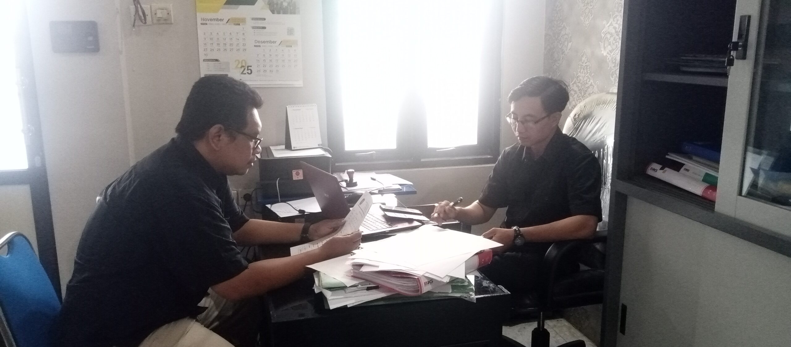 Moh. Husen, PLD (kiri) berkoordinasi dengan Sekdes Karangbendo, Arif Lukman Hakim (kanan), Selasa (25/11/2025)